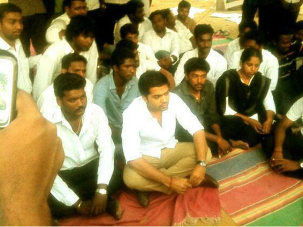 இலங்கையில் நடந்த போர்க்குற்றம் குறித்து சர்வதேச விசாரணை நடத்த வேண்டும், இலங்கை அதிபர் ராஜபக்சேவை போர்க்குற்றவாளியாக அறிவிக்க வேண்டும் என்பது உள்ளிட்ட கோரிக்கைகளை வலியுறுத்தி தமிழகம் முழுவதும் மாணவர்கள் உண்ணாவிரதம் இருந்து வருகின்றனர். இந்நிலையில் சென்னை அம்பேதகர் சட்டக்கல்லூரி மாணவர்களின் உண்ணாவிரதப் பந்தலுக்கு நேற்று நடிகர் சிலம்பரசன் வந்தார்.