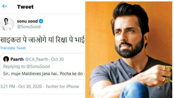 அதாவது, 'சார் எனக்கு மாலத்தீவுக்கு வெகேஷன் போகணும். கொஞ்சம் உதவி பண்ணுங்களேன்' என்று கேட்டுள்ளார். இதற்கு கிண்டலாக இந்தியில் பதிலளித்துள்ள சோனு சூட், நீங்க சைக்கிள்ல போவீங்களா, இல்லை ரிக்ஷாவிலயா, பாய்? என்று கூறியுள்ளார். இதை ஏராளமான நெட்டிசன்ஸ் ரீட்விட் செய்துள்ளனர்.