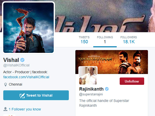 இதுநாள் வரை விஷாலை 18 ஆயிரம் பேர் பின்தொடர்ந்துள்ளார்கள். ஆனால், விஷாலோ ஒருவரை மட்டும்தான் பின்தொடர்ந்துள்ளார். அந்த ஒருவர் யாரென்றால் சூப்பர் ஸ்டார் ரஜினிதான். மற்ற நடிகர், நடிகைகளை இதுவரை அவர் தொடரவில்லை. இதற்கான காரணம் என்னவென்றும் தெரியவில்லை.