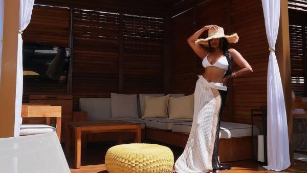 அதோடு பிகினிக்கு பாவாடையும் அணிந்துள்ளார் சந்திரிக்கா ரவி. கறுப்பு வெள்ளை நிறத்தில் வலை போன்று படு ட்ரான்ஸ்ப்ரன்ட்டாக உள்ள பாவாடையில் செம கூலாக போஸ் கொடுத்துள்ளார் சந்திரிக்கா ரவி.