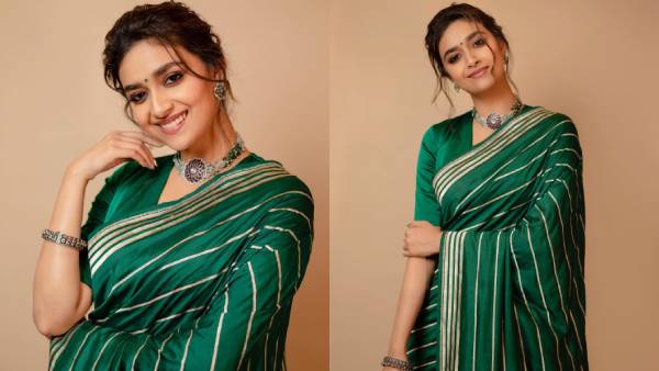 பச்சை நிறமே பச்சை நிறமே... பச்சை சேலையில் வெட்கத்தை கொட்டும் நடிகை கீர்த்தி சுரேஷ்