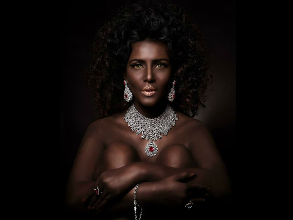 உடல் நிறத்தை கருப்பாக்கி ஒரு புகைப்படத்தில் நகை மட்டுமே தெரியும்படி கால்களை கட்டிக் கொண்டு அமர்ந்துள்ளார். மற்றொரு புகைப்படத்திலும் கவர்ச்சியாக போஸ் கொடுத்துள்ளார்.