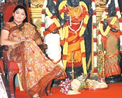 சென்னையில் நடந்த வல்லமை தாராயோ பட பூஜையின்போது கலந்து கொண்ட குஷ்பு, செருப்புக் காலோடு, கால் மேல் கால் போட்டபடி முப்பெரும் தேவியர் சிலைக்கு அருகே அமர்ந்திருந்தது சர்ச்சையாகியுள்ளது.