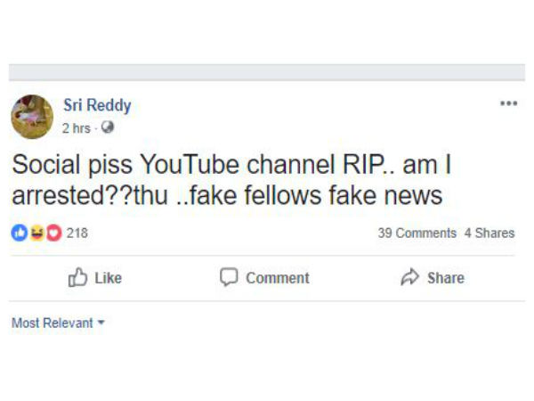 இதைத்தொடர்ந்து ஸ்ரீரெட்டி கைது செய்யப்பட்டார் என யூட்யூப் சேனல் ஒன்று செய்தி வெளியிட்டதாக தெரிகிறது.
