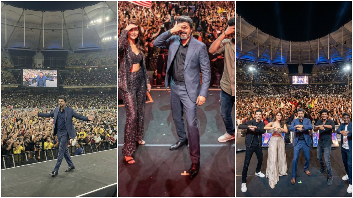 மேடையில் கிளாஸ் நடனம்: பின் நிகழ்ச்சிக்கு வருகை தந்த விஜய் கோட் சூட் அணிந்தபடி 'ரேம்ப் வாக்' கில் வந்து ரசிகர்களை நோக்கி கை அசைத்தார். விஜயின் மாஸ் என்ட்ரியை பார்த்து ஒட்டுமொத்த கூட்டமும் திக்குமுக்காடி போனது. இதையடுத்து, விஜய் வழக்கம் போல ரசிகர்களுடன் செல்ஃபி எடுத்துக்கொண்டார். மேடையில் விஜய், பூஜா ஹெக்டே, அனிருத், லோகேஷ் கனகராஜ், அட்லி ஆகியோருடன் சேர்ந்து போட்டோ எடுத்துக்கொண்டார். மேலும், இணையத்தில் அனைவரும் சேர்ந்து நடனமாடுவது போல ஏஐ போட்டோக்கள் வைரலாகி வருகின்றன.