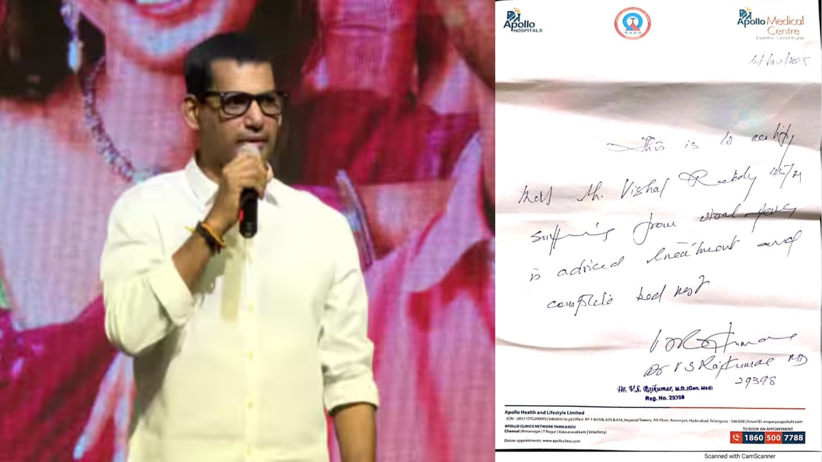 மோசமான விமர்சனம்: இதையடுத்து, இணையத்தில் விஷால் கை நடுக்கத்துடன் பேசும் வீடியோ காட்டுத்தீ போல பரவியது. இதுகுறித்து பேசிய பத்திரிக்கையாளர் சேகுவேரா, காய்ச்சல் வந்தால் ஏன் கை நடுங்க வேண்டும், காய்ச்சல் இருக்கும் போது எதற்கு நிகழ்ச்சிக்கு வரவேண்டும் என்று விமர்சனத்தை வைத்தார். இப்படி பலரும் பலவிதமான கருத்துக்களை கூறி வரும் நிலையில், அப்பல்லோ மருத்துவமனையில் இருந்து விஷால் உடல்நிலை குறித்து அறிக்கை வெளியிட்டுள்ளது. அதில், நடிகர் விஷால் வைரஸ் காய்ச்சல் இருப்பதாகவும், அவர் முழுமையான படுக்கையில் ஓய்வில் இருக்குமாறு அறிவுறுத்தப்பட்டதாகவும் கூறப்பட்டுள்ளது.