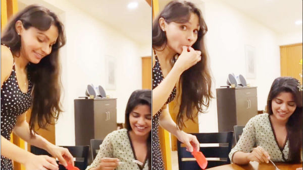 நடிகை ஐஸ்வர்யா ராஜேஷ் டைனிங் டேபிளில் அமர்ந்திருக்கக தளதளவென தான் செய்த கேக்கை எடுத்து வந்து டைனிங் டேபிளில் வைத்து ஐஸ்வர்யா ராஜேஷ்க்கு பரிமாறுகிறார் நடிகை ஆண்ட்ரியா.
