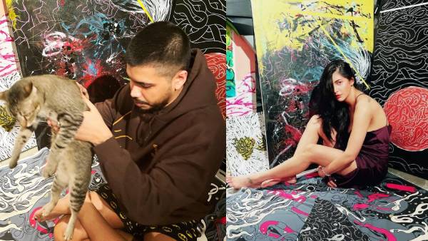 தனது காதலர் வரைந்த ஓவியங்களுக்கு மத்தியில் அமர்ந்து கொண்டுஇருக்கும் புகைப்படத்தை பகிர்ந்துள்ளார்.