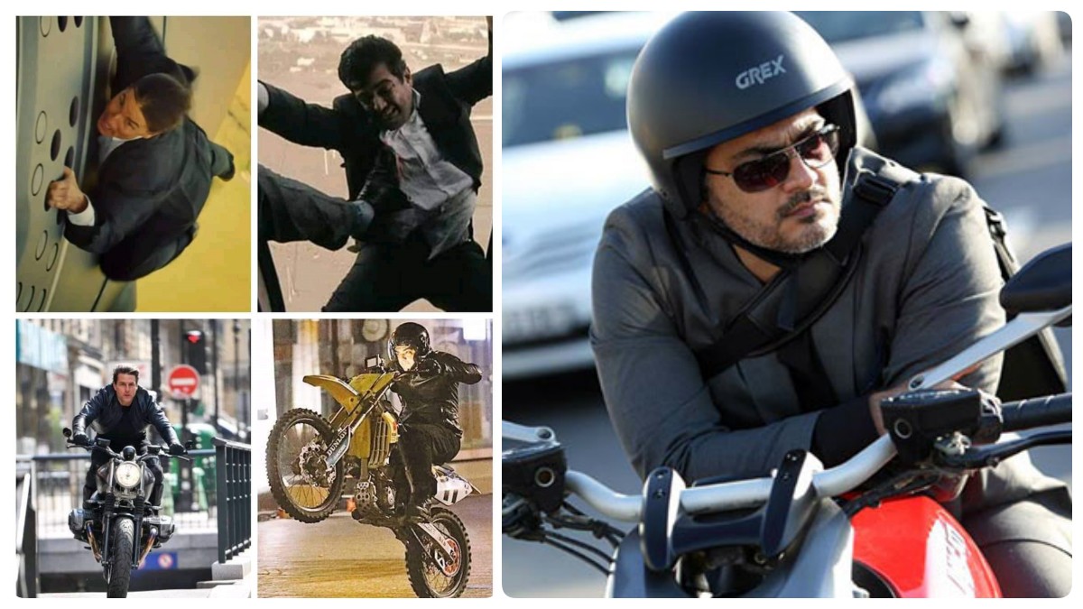 டாம் குரூஸ்க்கு சவால் விடும் அஜித்: கோலிவுட்டில் டாப் ஹீரோக்களில் ஒருவரான அஜித்துக்கு ஏராளமான ரசிகர்கள் உள்ளனர். ஆரம்பத்தில் காதல் மன்னனாக வலம் வந்த அஜித், பின்னர் ஆக்ஷனில் அதிரடி காட்டத் தொடங்கினார். அமர்க்களம், தீனா, சிட்டிசன் என ஆக்ஷன் ஜானர் படங்களில் கலங்கடித்த அஜித்துக்கு மங்காத்தா திரைப்படம் மிகப் பெரிய கம்பேக்காக அமைந்தது. இந்தப் படத்தில் நெகட்டிவ் ரோலில் நடித்திருந்த அஜித், ஒரே பைக் ஸ்டண்ட் சீனில் ரசிகர்களை சிலிர்க்க வைத்திருந்தார். பணம் கொள்ளையடிக்கும் காட்சியில் ஹைவேஸில் வீலிங் செய்தபடியே அஜித் செய்த பைக் சாகசம், அவரது ரசிகர்களை உற்சாகத்தில் ஆழ்த்தியது. அதன்பின்னர் அஜித் நடித்த படங்களில் பெரும்பாலும் பைக் சேஸிங் சீன் அல்லது பைக் ஸ்டண்ட் கண்டிப்பாக இருக்கும்.