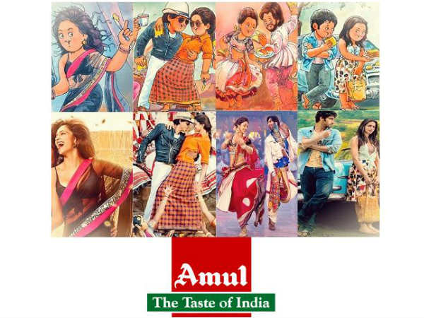 ஷாருக் கானுடன் தீபிகா ஆடும் லுங்கி டான்ஸ், யேக் ஜவானி ஹேய் தீவானி படத்தில் ரன்பீருடன் கிளாமர் ஆட்டம் போடும் தீபிகா, ராம் லீலாவில் ரன்பீர் கபூருடன் ரொமான்ஸ் செய்யும் தீபிகா, அர்ஜூன் கபூருடன் பைண்டிங் பேணியில் காதலிக்கும் தீபிகா என அனைத்து படங்களில் இருந்தும் ஸ்டில்ஸ்களைப் போட்டு பிறந்தநாள் வாழ்த்து கூறியுள்ளது அமுல்.