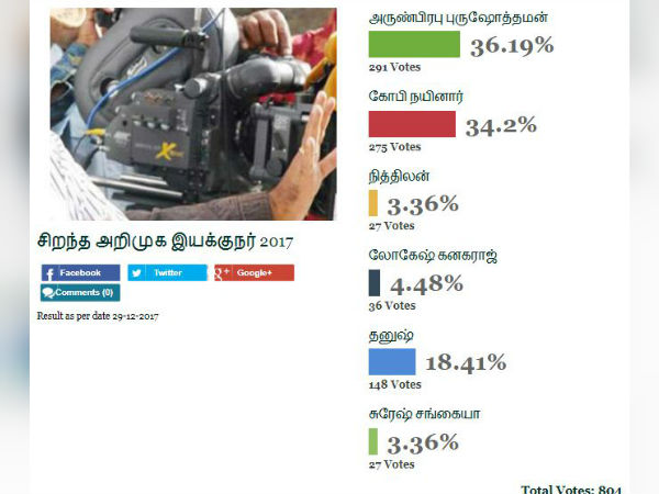 கருத்துக்கணிப்பில் தேர்வு செய்யப்பட்ட ஆறு அறிமுக இயக்குநர்களில் 'அருவி' படத்தின் இயக்குநர் அருண் பிரபு புருஷோத்தமன் 36% வாக்குகளைப் பெற்று முதலிடத்தைப் பிடித்திருக்கிறார். படத்தின் ஷூட்டிங் முடிந்து மூன்று வருடங்கள் கடந்து, பல பிரச்னைகளுக்குப் பிறகு ரிலீஸான 'அருவி' படத்தை மக்கள் கொஞ்சினார்கள்; கொண்டாடினார்கள்.