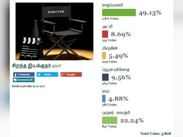 அவ்வகையில், சிறந்த இயக்குநர் 2017 யார் எனும் பிரிவில் வாசகர்களின் அமோக வரவேற்பைப் பெற்று இயக்குநர் ராஜமௌலி முதலிடத்தைப் பிடித்திருக்கிறார்.