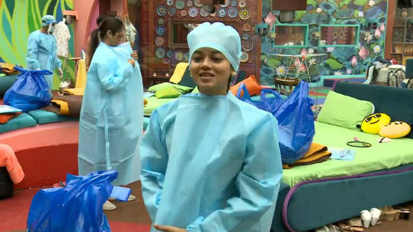 கொரோனா தொற்று பரவாமல் தடுக்கும் உச்சக்கட்ட பாதுகாப்பு உபகரணங்களையும் முக ஷீல்டுகளையும் அணிந்து கொண்டு விண்வெளிக்கு செல்லும் வீரர்கள் போல, அந்த வீட்டை விட்டு ஒட்டுமொத்த போட்டியாளர்களும் வெளியேறிய காட்சிகளும், பிக் பாஸ் வீட்டுக்குள் மழை கொட்டிக் கொட்டிருந்த காட்சிகளையும் காண்பித்தனர்.