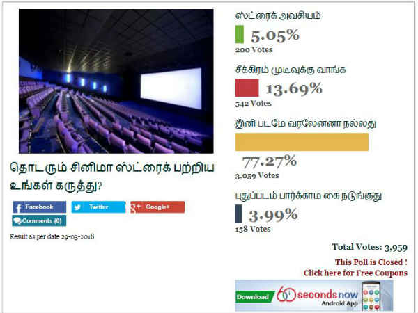 நம் தளம் சார்பாக வாசகர்களிடம் நடத்திய கருத்துக் கணிப்பில் 77% க்கும் அதிகமானோர் "இனி படமே வரலேன்னா நல்லது" எனக் கூறியுள்ளனர். தமிழ் சினிமா, டிக்கெட் விலை, ஸ்நாக்ஸ் விலை எல்லாமும் சேர்ந்து ரசிகர்களிடையே பெரும் அதிருப்தியை உண்டாக்கியிருப்பது தெளிவாகிறது. இதற்கு தீர்வு ஏற்படுத்த முயற்சியுங்கள் சினிமா ஆர்வலர்களே!