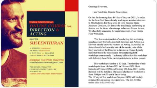 இந்நிலையில், வெண்ணிலா கபடிக்குழு புகழ் இயக்குனர் சுசீந்திரன் ஒரு அறிக்கை ஒன்றை வெளியிட்டுள்ளார். அதில், திரைப்படத் தயாரித்தல் மற்றும் நடிப்பு குறித்த ஆன்லைன் பாடத்திட்டத்தைத் தொடங்கவும், அந்த நிதியை தமிழக முதல்வரின் கொரோனா நிவாரண நிதிக்கு பயன்படுத்தவும் முடிவு செய்துள்ளதாக கூறியுள்ளார்.