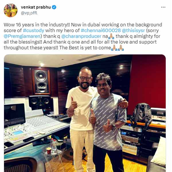 இந்தப் படத்தை தொடர்ந்து தற்போது தமிழ் மற்றும் தெலுங்கில் நாக சைத்தன்யாவை ஹீரோவாக வைத்து கஸ்டடி படத்தை இயக்கி முடித்துள்ளார். இந்தப் படம் அடுத்த மாதம் ரிலீசாகவுள்ள நிலையில், படத்தின் பாடல்கள் உள்ளிட்டவை வெளியாகி ரசிகர்களை வெகுவாக கவர்ந்துள்ளன. இந்நிலையில் இந்தப் படத்தின் பேக்கிரவுண்ட் இசைக்காக தற்போது துபாயில் யுவன் சங்கர் ராஜாவுடன் இசைக்கோர்ப்பு வேலைகளில் ஈடுபட்டுள்ளதாக வெங்கட் பிரபு தெரிவித்துள்ளார்.