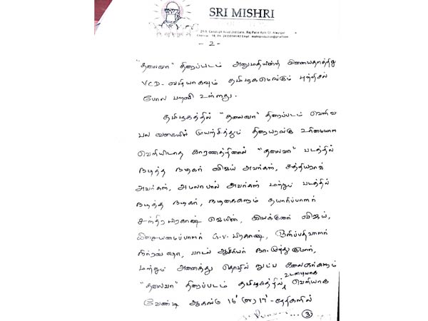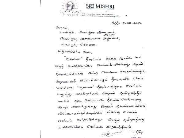 தலைவா திரைப்படம் தமிழகத்தில் உடனடியாக வெளியாகக் கோரி இன்று 16 அல்லது 17-ம் தேதி அரசு அனுமதிக்கும் இடத்தில் உண்ணாவிரதம் இருக்க முடிவு செய்துள்ளோம். இதற்கு தாங்கள் அனுமதி அளிக்குமாறு வேண்டிக் கேட்டுக் கொள்கிறோம்," என்று எழுதியுள்ளார்.