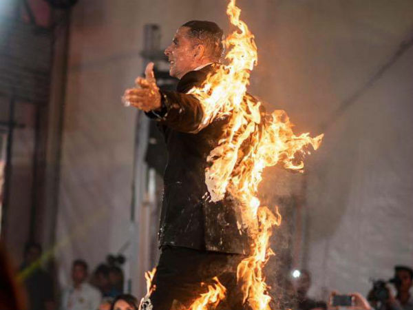 அந்த நிகழ்ச்சியில் அக்ஷய் குமார் தன் மீது நெருப்பு வைத்துக் கொண்டு நடந்து வந்தார்.