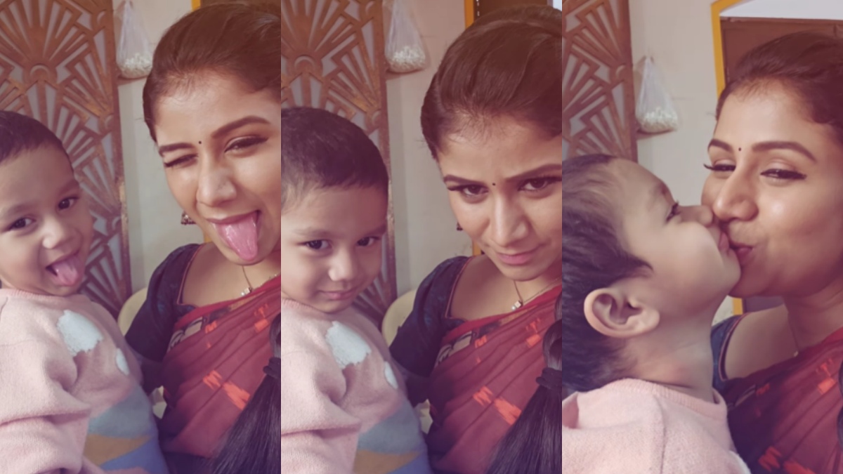 உதட்டில் முத்தம்: இவர்களுக்கு 2 குழந்தைகளும் இருக்கின்றார்கள். அண்மையில் கூட, ரூபாய் 1.8 கோடி செலவு செய்து ஸ்டார் ஹோட்டல் அளவிற்கு பிரமாண்டமான வீட்டினைக் கட்டி முடித்தனர். இவர்களது ஹோம் டூர் வீடியோ இணையத்தில் கலக்கிக் கொண்டு உள்ளது. இந்நிலையில், தான் நடித்து வரும் இனியா சீரியலின் படப்பிடிப்புத் தளத்திற்கு ஆல்யா மானசா தனது மகனை அழைத்துச் சென்றுள்ளார். மேலும் அங்கு கிடைத்த ஓய்வு நேரத்தில் மகனுக்கு வாயில் முத்தம் கொடுத்தும், தன்னைப் போல போஸ் கொடுக்கச் சொல்லியும் கொஞ்சிக் கொண்டு உள்ளார். அவரது மகனும் ஆல்யா மானசா என்ன செய்கின்றாரோ, அதேபோல் போஸ் கொடுக்கின்றர்.