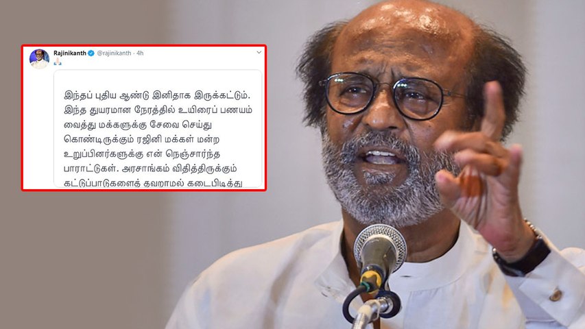 இதனால் நாடு முழுக்க அறிவிக்கப்பட்ட ஊரடங்கு உத்தரவு நீட்டிக்கப்பட்டுள்ளது. இந்நிலையில் நடிகர் ரஜினிகாந்த் இன்று தனது டிவிட்டர் பக்கத்தில் பதிவு ஒன்றை வெளியிட்டிருந்தார். அதில் இந்த புதிய ஆண்டு இனிதாக இருக்கட்டும். இந்த துயரமான நேரத்தில் உயிரை பணயம் வைத்து மக்களுக்கு சேவை செய்து கொண்டிருக்கும் ரஜினி மக்கள் மன்ற உறுப்பினர்களுக்கு என் நெஞ்சார்ந்த பாராட்டுகள்.
