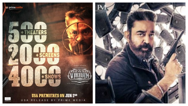 500 திரையரங்குகள், 2000 ஸ்க்ரீன்கள் மற்றும் 4000 காட்சிகள் என அமெரிக்காவில் பெரியளவில் விக்ரம் படத்தை ரிலீஸ் செய்ய முடிவு செய்துள்ளார் கமல்ஹாசன். ஜூன் 2ம் தேதியே அமெரிக்காவில் விக்ரம் படம் வெளியாகிறது. உலகநாயகன் எனும் பட்டத்தை சும்மா பயன்படுத்திக் கொள்ளாமல், உலகளவில் வசூல் வேட்டையை நிகழ்த்தி காட்டி விட வேண்டும் என தீர்மானித்து விட்டாரா கமல் என நெட்டிசன்கள் கமெண்ட் போட்டு பாராட்டி வருகின்றனர்.
