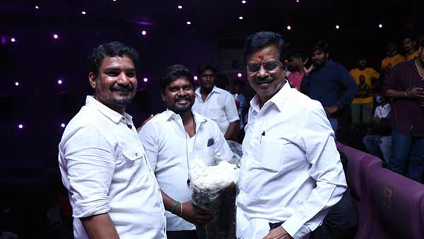 வி கிரியேஷன் தயாரிப்பாளர் கலைப்புலி எஸ். தாணு தயாரிப்பில் கர்ணன் திரைப்படம் இன்று வெளியாகி உள்ளது. 50 சதவீத இருக்கைகளுக்கு மட்டுமே அனுமதி என அதிரடி உத்தரவு பிறப்பிக்கப்பட்ட நிலையிலும், கர்ணன் ரிலீசில் எந்தவொரு மாற்றமும் இல்லை என அறிவித்து கர்ணன் திரைப்படத்தை வெளியிட்டுள்ள கலைப்புலி எஸ். தாணு சென்னை ரோகிணி திரையரங்கில் கர்ணன் படக்குழு மற்றும் ரசிகர்களுடன் இணைந்து படத்தை பார்த்துள்ளார்.