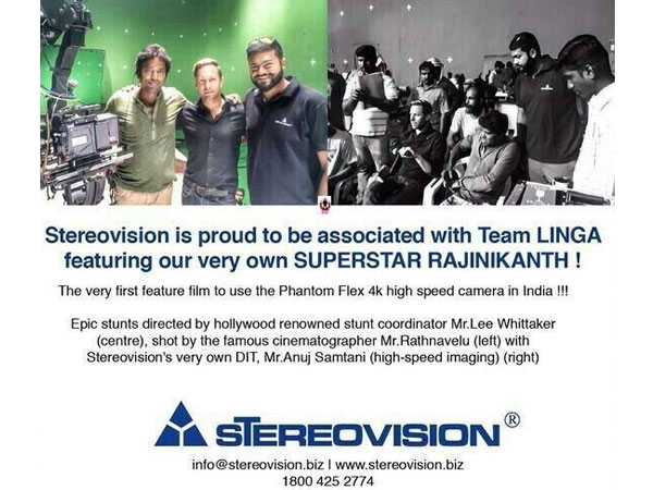 இந்த காமிராவை ஸ்டீரியோவிஷன் நிறுவனம் லிங்காவுக்கு வழங்கியுள்ளது.
