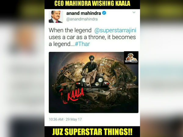 காலா படத்தில் தாராவி டானாக நடிக்கும் ரஜினிகாந்த் பயன்படுத்தும் வாகனம் இந்த ஜீப்தான். அதை முதல் தோற்றப் போஸ்டரில் காட்டியதன் மூலம், பெரிய விளம்பரம் கிடைத்த மகிழ்ச்சியில் ஆனந்த் மகிந்திரா இவ்வாறு ட்வீட்டியுள்ளார்.