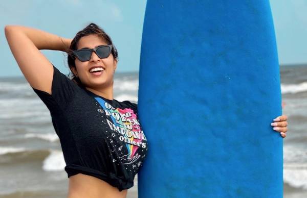 மற்றொரு போட்டோவில் கடலுக்கு அலைச்சறுக்கு விளையாடச் செல்வது போல போஸ் கொடுத்துள்ளார். முதன்முறையாக அலைச்சறுக்கு அனுபவம் அலாதியாக இருந்தது என்று கூறியுள்ளார். சிலர், மகாபலிபுரத்துல இது எங்க இருக்கு? என்று கேட்டுள்ளனர். நிகிதாவின் இந்த புகைப்படங்கள் வைரலாகி வருகின்றன.