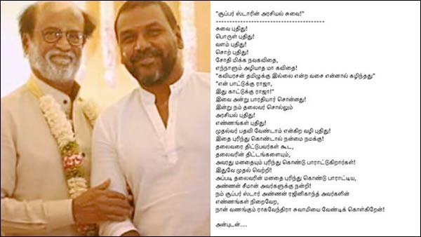 இந்நிலையில், சூப்பர் ஸ்டாரின் அரசியல் சுவை என்ற தலைப்பில் ராகவா லாரன்ஸ் எழுதியுள்ள கவிதை ரசிகர்கள் மத்தியில் வரவேற்பை பெற்று வருகிறது.