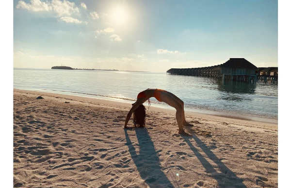 வெகேஷன்னாலும் ஒர்க் அவுட் முக்கியம்ல.. வில்லாக வளைந்து வைட்டமின் டி தேடும் பிரபல ஹீரோயின்!