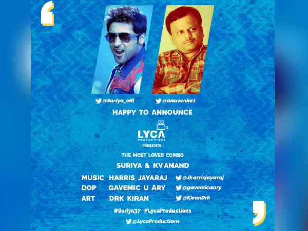 சூர்யாவின் 37-வது படத்தை லைகா நிறுவனம் தயாரிக்கிறது. ஹாரிஸ் ஜெயராஜ் இசையமைக்கிறார். கேவ்மிக் ஆரி ஒளிப்பதிவு செய்ய, கிரண் கலை இயக்கத்தை கவனிக்கிறார். இதற்கான அதிகாரப்பூர்வ அறிவிப்பு வெளியிடப்பட்டுள்ளது.