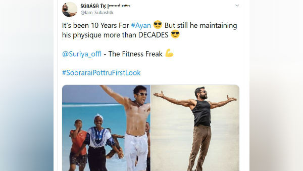 2009ம் ஆண்டு கே.வி. ஆனந்த் இயக்கத்தில் சூர்யா நடிப்பில் வெளியான அயன் படத்தில் எப்படி இருந்தாரோ சூர்யா, அதேபோல 10 ஆண்டுகள் கழித்து 2019ம் ஆண்டிலும் அதே கட்டுமஸ்த்தான உடலுடன் தோற்றம் அளிக்கிறார் என அயன் மற்றும் சூரரை போற்று ஃபர்ஸ்ட் லுக் படங்களை பதிவிட்டு இந்த ரசிகர் கமெண்ட் செய்துள்ளார்.