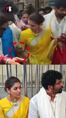 அப்படியிருந்தும் நயன்தாரா வந்ததை அறிந்த பக்தர்கள் அவரை காண திடீரென திரண்டனர். பவுன்சர்கள் உதவியுடன் கூட்டத்தில் சிக்கிக் கொள்ளாமல் செல்ல வேண்டும் என விறு விறுவென நயன்தாரா மற்றும் விக்னேஷ் சிவன் அங்கிருந்து புறப்பட்டுச் சென்றனர். அப்போது திடீரென ஒரு கை நயன்தாராவின் கையை அழுத்தமாக பிடித்தது.