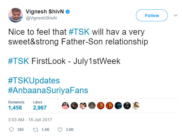 #AnbaanaSuriyaFans என ட்விட்டரில் தெரிவித்துள்ளார் விக்னேஷ் சிவன்.