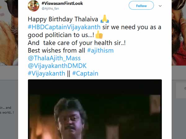 சென்னை: உடல்நலம் பெற்று கம்பீரமாக அரசியலுக்கு வர வேண்டுமென்று அஜித் ரசிகர்கள் விஜயகாந்துக்கு பிறந்தநாள் வாழ்த்து தெரிவித்துள்ளனர்.