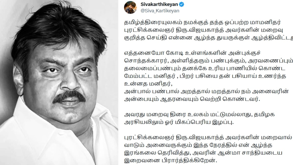 இந்நிலையில், விஜயகாந்தின் மறைவுக்கு தனது டிவிட்டர் பக்கத்தில் இரங்கல் தெரிவித்துள்ளார் சிவகார்த்திகேயன். அதில், "தமிழ்த் திரையுலகம் நமக்குத் தந்த ஒப்பற்ற மாமனிதர் புரட்சிக் கலைஞர் திரு. விஜயகாந்த் அவர்களின் மறைவு குறித்த செய்தி என்னை ஆழ்ந்த துயருக்குள் ஆழ்த்திவிட்டது. எத்தனையோ கோடி உள்ளங்களின் அன்புக்குச் சொந்தக்காரர், அள்ளித்தரும் பண்புக்கும், அரவணைப்பும் தலைமைப் பண்பும் தனக்கே உரிய பாணியில் கொண்ட மேம்பட்ட மனிதர், பிறர் பசியை தன் பசியாய் உணர்ந்த உன்னத மனிதர்"