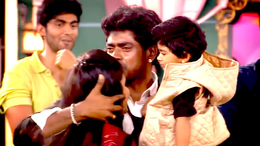 தனது மகளை பார்த்த சாண்டி கதறி அழுகிறார். தொடர்ந்து மகளை கட்டி அணைத்து, கண்ணீர் விட்டபடியே தனது மனைவியையும் வாரி அணைத்து முத்தம் கொடுக்கிறார்.
