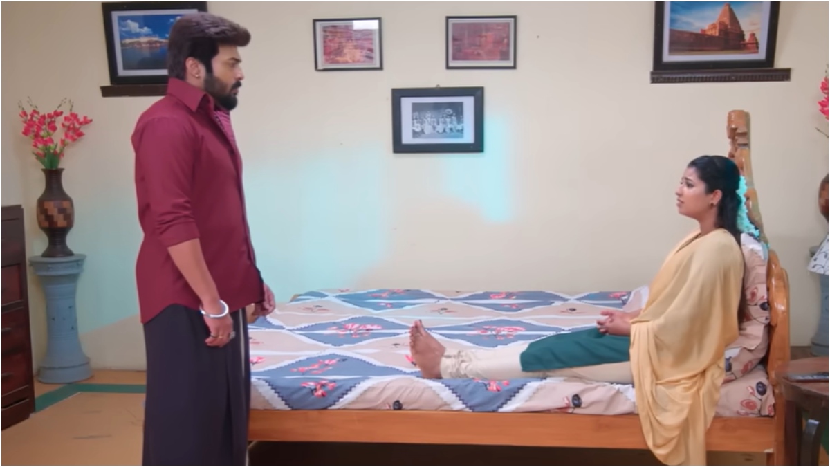 இதனை தொடர்ந்து ரூமுக்கு சென்ற ரேவதி கால் வலிக்குது என்று ட்ராமா போட கார்த்திக் அவளுக்கு மருந்து போட்டு விடுகிறான். ஒரு கட்டத்தில் ரேவதி நடிப்பை புரிந்து கொண்ட கார்த்திக் பல்லி இருப்பதாக சொல்ல ரேவதி பயந்து ஓடுகிறாள். பிறகு அவளிடம் எதுக்கு இப்படியெல்லாம் பண்ணனும் என்று கேட்க இந்த வலியை கூட தாங்கலைனா எப்படி பிரசவ வலியை தாங்குறது என்று சொல்ல, கார்த்திக் ஒழுங்கா போய் தூங்குங்க என்று சொல்ல ரேவதி பாட்டு பாடி அவனை வெறுப்பேற்றியபடி இருக்கிறாள்.